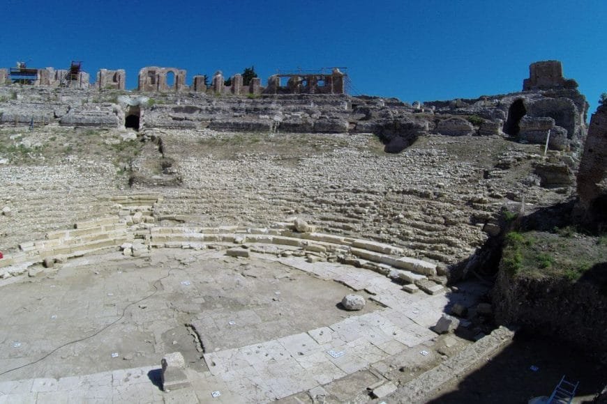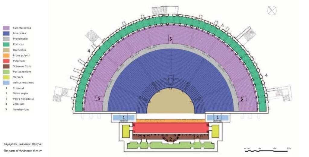Στο σύγγραμμα του Ρωμαίου αρχιτέκτονα Βιτρούβιου (θάνατος 15 π.Χ.) De Arcitectura περιγράφονται τα μορφολογικά χαρακτηριστικά του “ιδανικού” θεάτρου κατά τον ρωμαϊκό τρόπο και τα χαρακτηριστικά των ελληνικών θεάτρων σε σύγκριση με τα ρωμαϊκά: Το κοίλο των ελληνικών θεάτρων στηριζόταν πάντοτε απευθείας σε επίπεδο φυσικών πρανών με ανάλογες κατά περίπτωση διευθετήσεις και αποχωματώσεις. Στα ρωμαϊκά θέατρα εμφανίζεται η καινοτομία της στήριξης του κοίλου σε θολωτές υποδομές που θεμελιώνονταν σε επίπεδο έδαφος. Η τεχνική αυτή επέτρεπε την ανέγερση θεάτρων σε αστικά κέντρα εφόσον δεν απαιτούσε πλέον την ύπαρξη φυσικών πρανών.